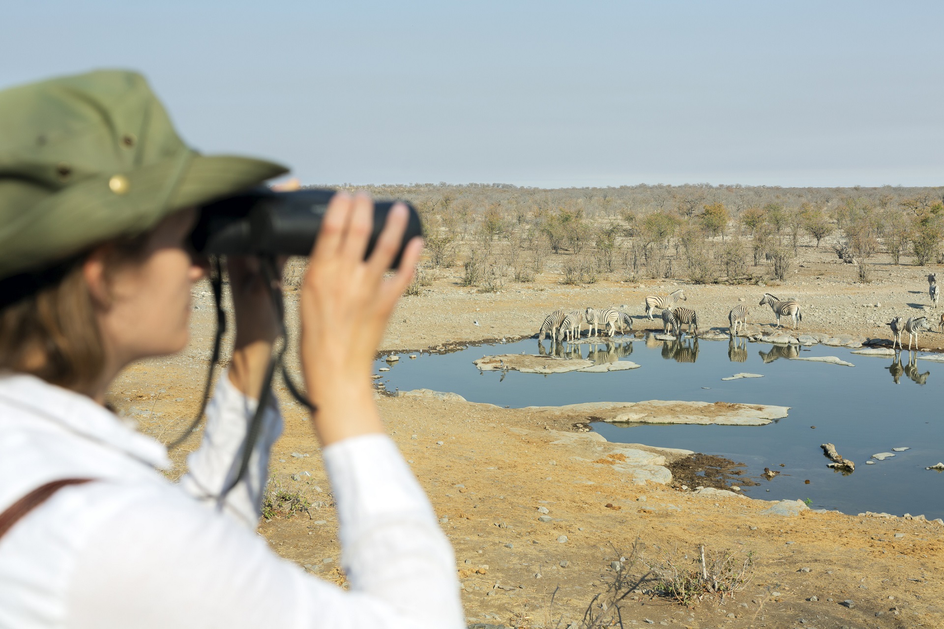 Travellers spend the day exploring the world‑famous Etosha National Park, home to 114 animal species and 340 bird species. Every turn reveals something new — zebra, elephant, giraffe, oryx, springbok, kudu, and even the rarely seen black‑nosed impala. With luck, lions, leopards, cheetahs, or hyenas may be spotted in the early morning or late afternoon. The vast Etosha Pan shimmers golden in the sunlight or fills with thousands of birds after the rains. Roads lead to the best waterholes before the journey concludes at Andersson Gate at sunset.